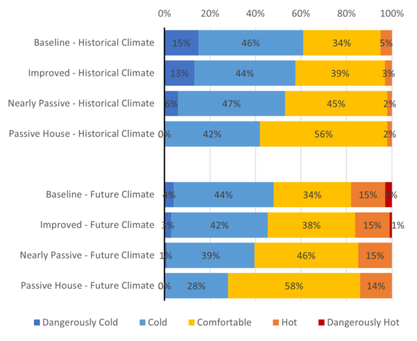 This benefit has been borne out by multiple studies (including our own) and by measured performance of actual buildings. For example, a recent study by the Pacific Northwest National Laboratory found that Passive House building increased “days of safety” and reduced “excess mortality” significantly in all climate zones, compared to code minimum buildings [9]. Similarly, our own analysis of the Bondurant Passive House, an addition and retrofit outside of Des Moines, found that Passive House assemblies provided significant improvement over conventional assemblies, reducing the portion of the year that was “too hot” or “too cold” by 37%, and bringing “dangerously cold” and “dangerously hot” hours to zero in both current and future climate scenarios.