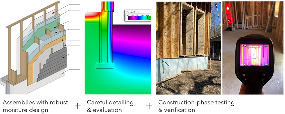 The first is careful water management and moisture control. Water is the biggest cause of durability problems in homes. Phius certification incorporates numerous best practices and mandatory moisture control measures to ensure that stormwater is properly managed, moisture-sensitive materials are kept away from water, and assemblies can dry if they do get wet.