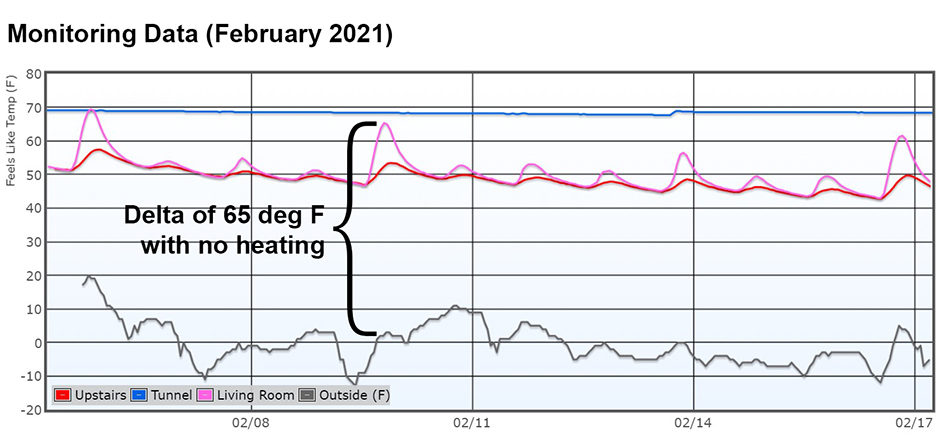 These results are not only theoretical. We have seen the impact of these strategies play out dramatically at the Iowa Nest Residence. During the polar vortex of 2021, outdoor temperature stayed below freezing for over two weeks, dipping as low as -13degF. The home maintained interior temperatures between 44 and 70 degF—an average delta of 50degF—with no mechanical heating whatsoever [10].
