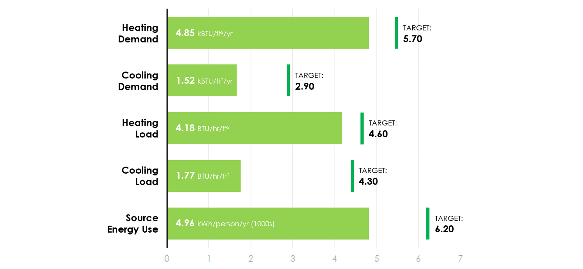 Muncy Greene is an affordable senior housing development consisting of 60 semi-detached units and a community space. The central challenges were to meet ambitious Passive House targets in a cost-effective way, to find synergies between PHIUS+ and EGC to streamline compliance with the two standards, and to navigate a sequential construction schedule that involved numerous site visits and testing trips. In addition, the connected garages added compartmentalization challenges.